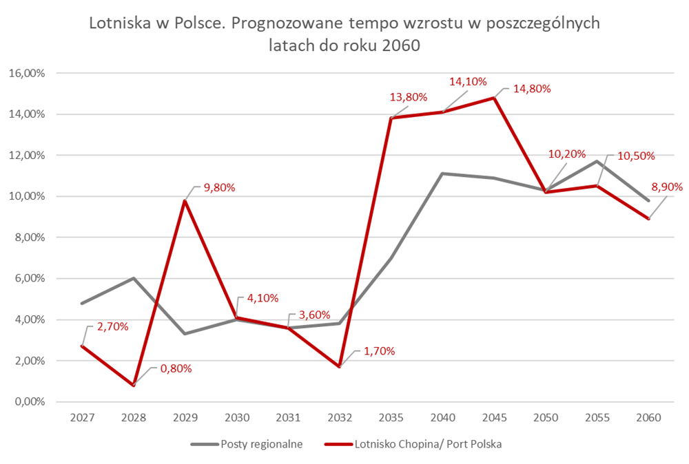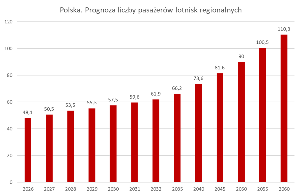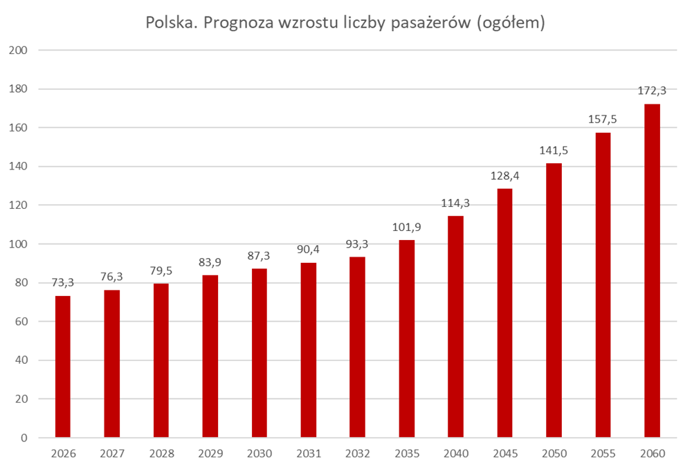 IATA szacuje, że w 2033 roku, czyli w momencie otwarcia nowego centralnego lotniska budowanego w ramach projektu Port Polska, ruch pasażerski w kraju sięgnie ok. 95 mln osób, a w roku 2035 przekroczona zostanie historyczna bariera 100 mln pasażerów.