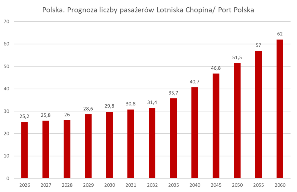 zbieżne z tymi jakie IATA przedstawiła już w roku 2024. O takim samym tempie wzrostu mówiły również władze PPL w ostatnich latach. Do roku 2029 stołeczny port ma więc obsługiwać 28,6 mln pasażerów a później tempo ich przyrostu spadnie ze względu na prowadzone prace modernizacyjne. Do roku 2032 na Okęciu ma być 31,4 mln pasażerów.