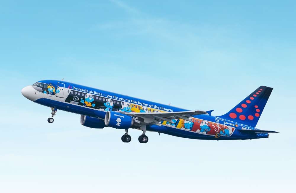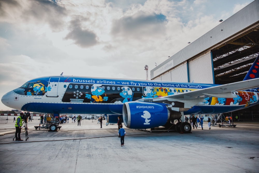 Samolot jest w pełni dedykowany ukochanym małym niebieskim Smerfom. Świat stworzony przez rysownika Peyo podbija serca dzieci i dorosłych już od 60 lat. Nazwa Aerosmurf wywodzi się od tytułu jednego z komiksów o Smerfach, który opowiada historię małego Smerfa marzącego o lataniu. Teraz, dzięki Brussels Airlines, Smerfy szybują po całym świecie. Dla pasażerów lecących tym samolotem zewnętrzne malowanie maszyny to tylko początek przygody. Drobne ślady skrzatów na dywanach prowadzą gości Aerosmurfa na swoje miejsca, a film o przygodach niebieskich stworków oraz dostosowana muzyka na pokładzie dopełniają smerfastyczne wrażenia.