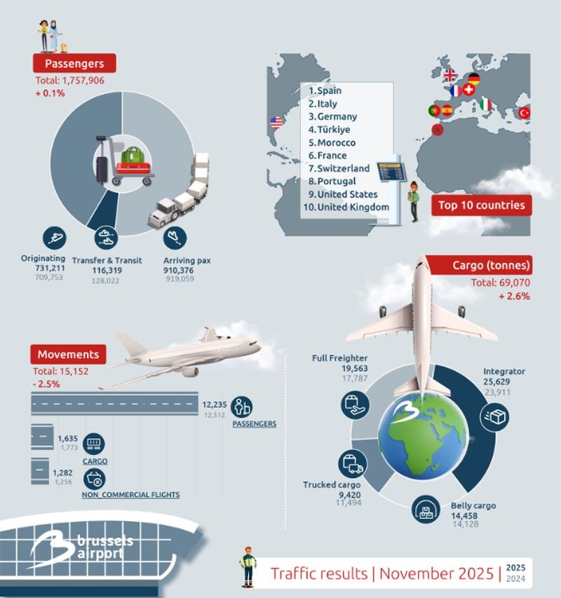 Najpopularniejszymi kierunkami dla podróżujących ze stolicy Belgii były w listopadzie Hiszpania, Włochy, Niemcy, Turcja i Maroko. Czołową "10" uzupełniły, Francja, Szwajcaria, Portugalia, Stany Zjednoczone i Wielka Brytania. Średnio 144 pasażerów zabierał na pokład każdy samolot odlatujący w listopadzie z Brukseli. To o czterech więcej podróżnych więcej, aniżeli w tym samym miesiącu ubiegłego roku.