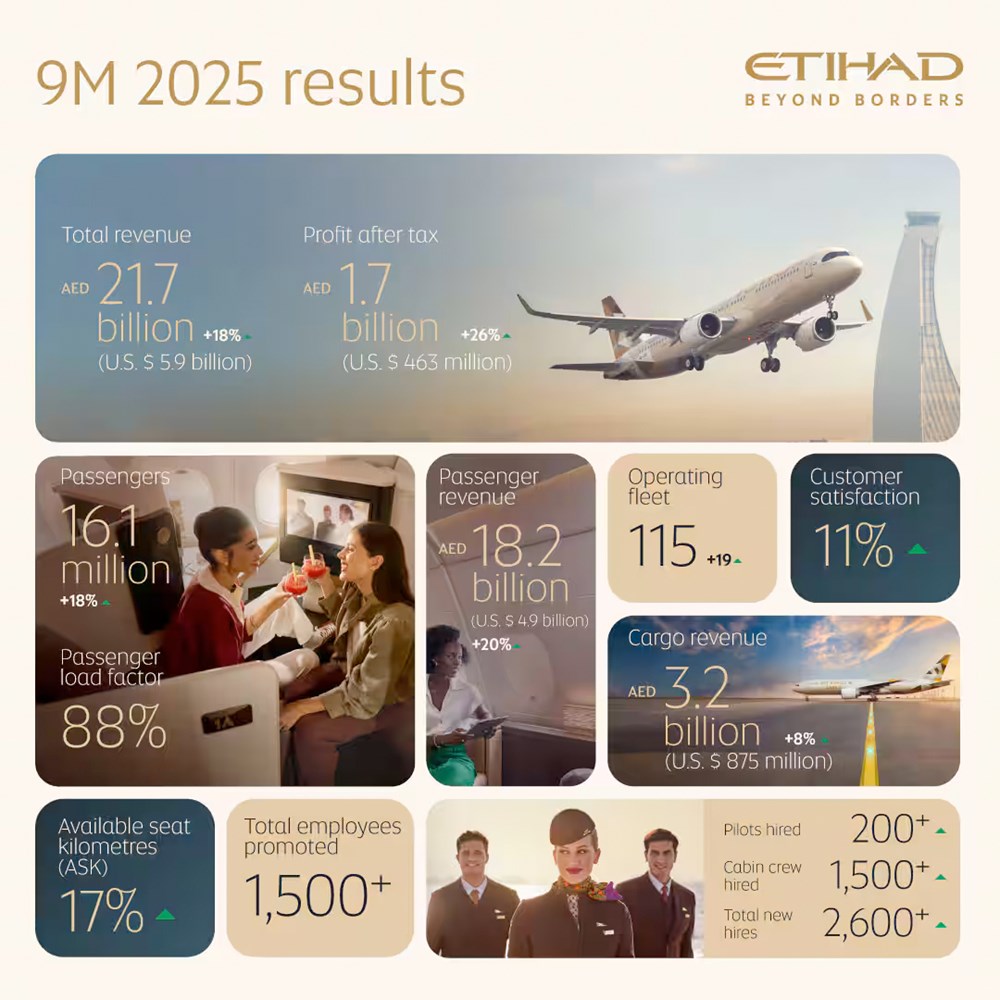 Etihad Airways kończy trzeci kwartał 2025 r. z rekordowymi wynikami finansowymi, największą w historii liczbą pasażerów, dynamicznie rozwijającą się flotą i rosnącym zadowoleniem klientów. Linie wyraźnie przyspieszają ekspansję, umacniając swoją pozycję jako jednego z najszybciej rosnących przewoźników na świecie.