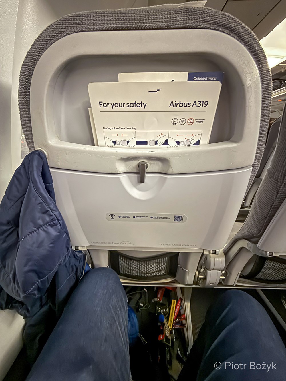 Punktualnie o 18:50 pojawia się informacja, że samolot jest gotowy do przyjęcia pasażerów na pokład. Wejście na pokład (boarding) odbywa się przez rękaw z bramki 26. Do Helsinek polecimy na pokładzie airbusa A319 (OH-LVH). Samolot posiada konfigurację foteli 3-3, a na pokład zabiera 144 pasażerów. Wnętrze maszyny jest zadbane, czyste i jasne, ale widać już nieco upływający czas.