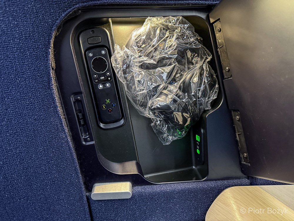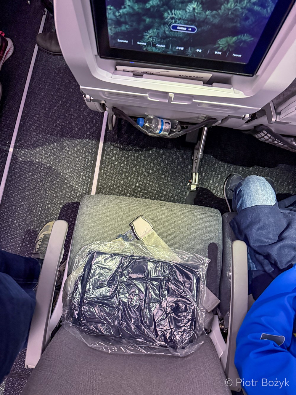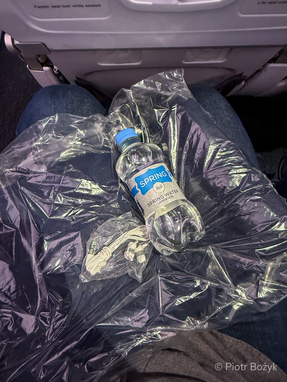 Na każdego z pasażerów klasy ekonomicznej czeka na fotelu koc, butelka wody mineralnej oraz douszne słuchawki do pokładowego systemu IFE.