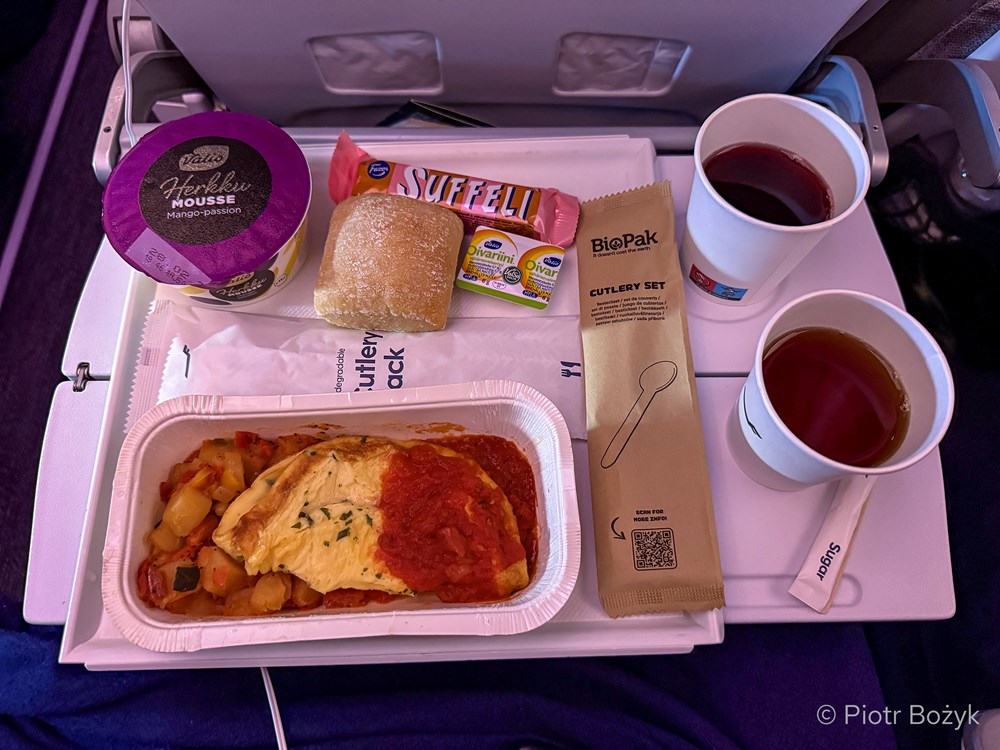 Drugi z serwowanych posiłków to śniadanie na ciepło, które podawane jest około trzech godzin przed lądowaniem. Nasz zestaw to danie główne (omlet), warzywa, pieczywo, dżem, batonik oraz pianka czekoladowa. Do tego wybór napojów ciepłych (herbata, kawa, czekolada) oraz zimnych (cola, soki, woda).