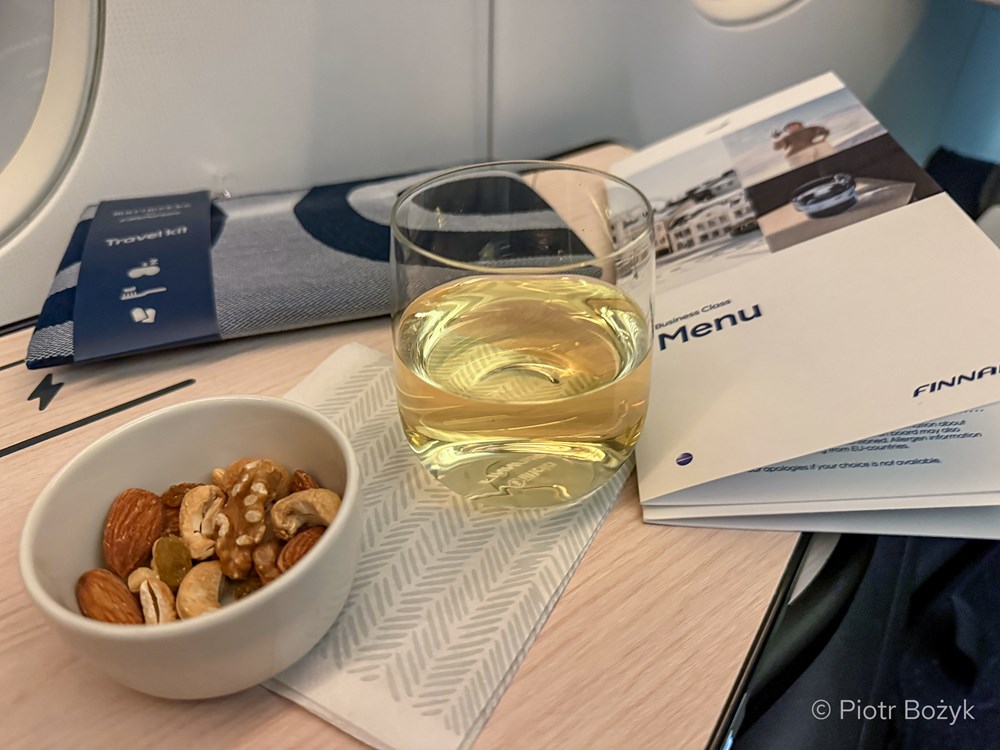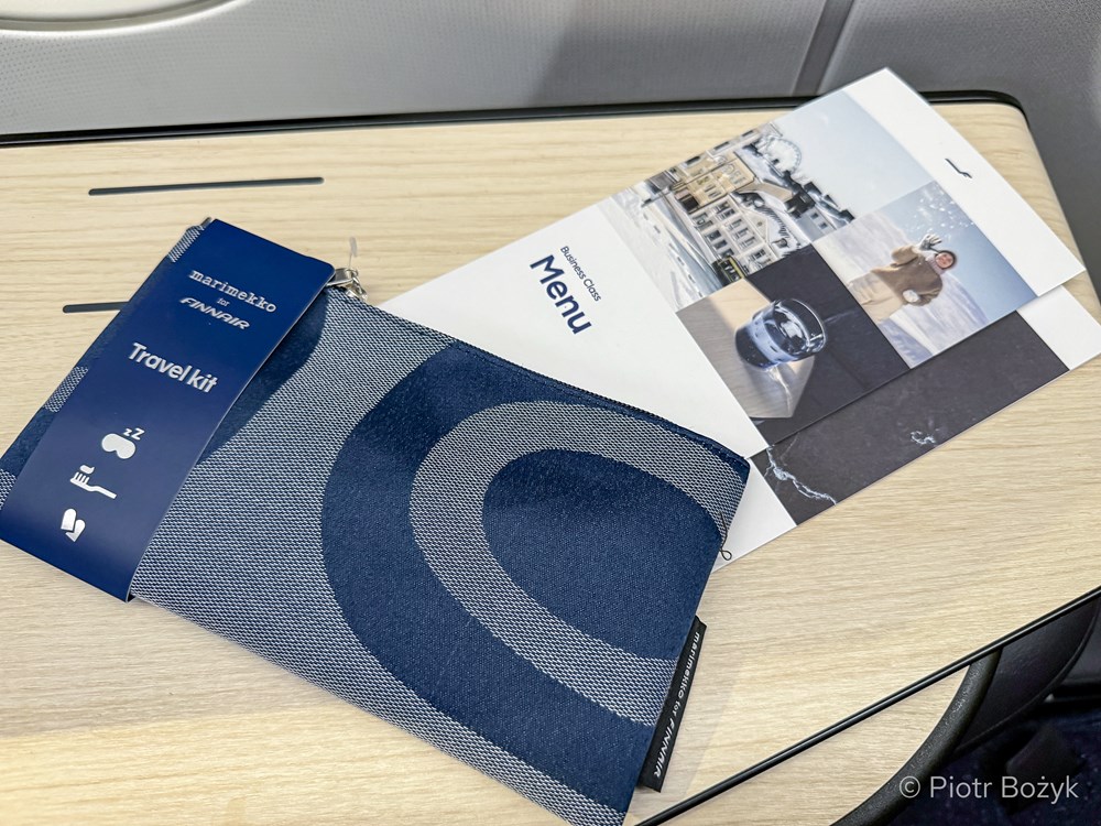 Obsługa pasażerów klasy biznes jest zindywidualizowana. Zaraz po zajęciu swojego miejsca każdy z pasażerów otrzymuje powitalnego drinka (welcome drink) oraz menu z daniami i winami serwowanymi na pokładzie. Pasażerowie klasy biznes linii Finnair na trasach długodystansowych mogą korzystać z zestawu przyborów osobistych zaprojektowanego specjalnie dla linii przez Marimekko. Etui zostało zaprojektowane tak, aby przetrwało nie tylko podróż liniami Finnair, ale także nieprzerwane korzystanie z niego po zakończeniu podróży. Tutaj mały minus, bo w środku znajduje się tylko szczoteczka i pasta do zębów oraz opaskę na oczy i zatyczki do uszu, a brak jest jakichkolwiek kosmetyków.