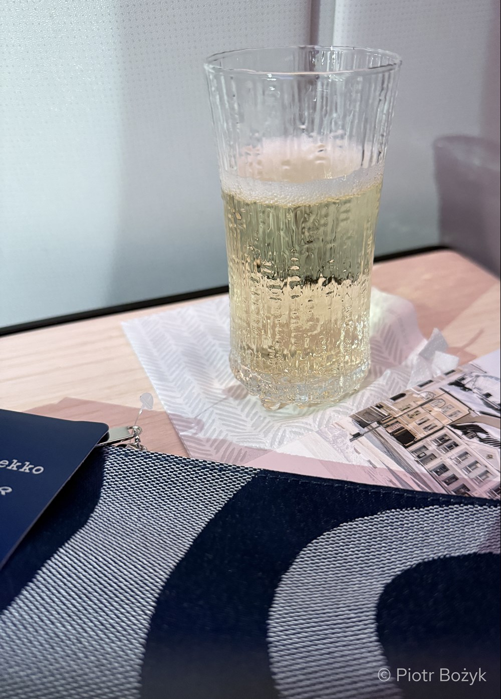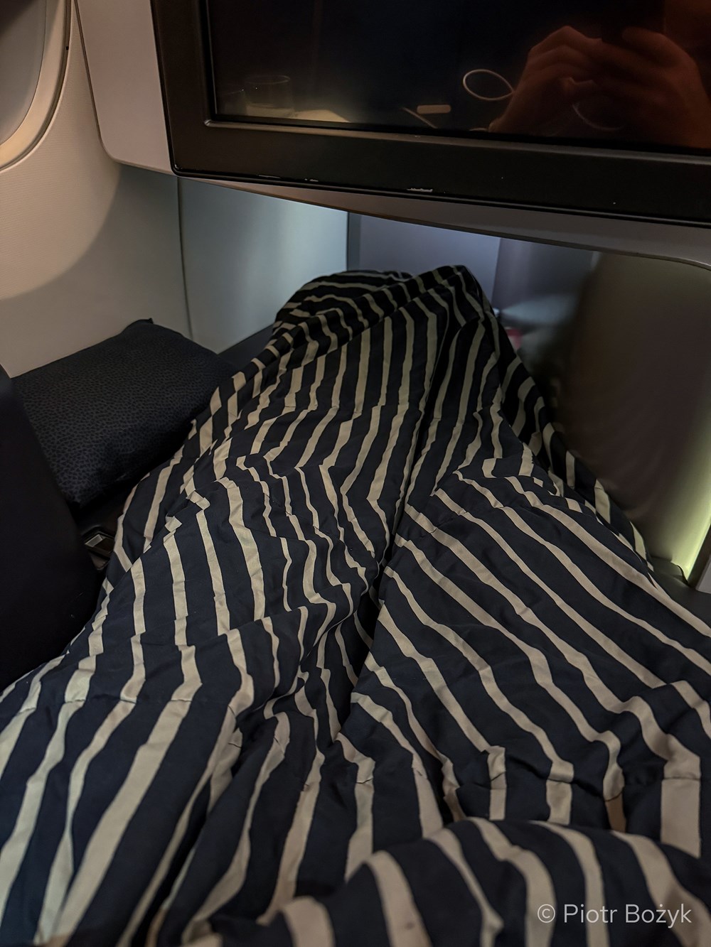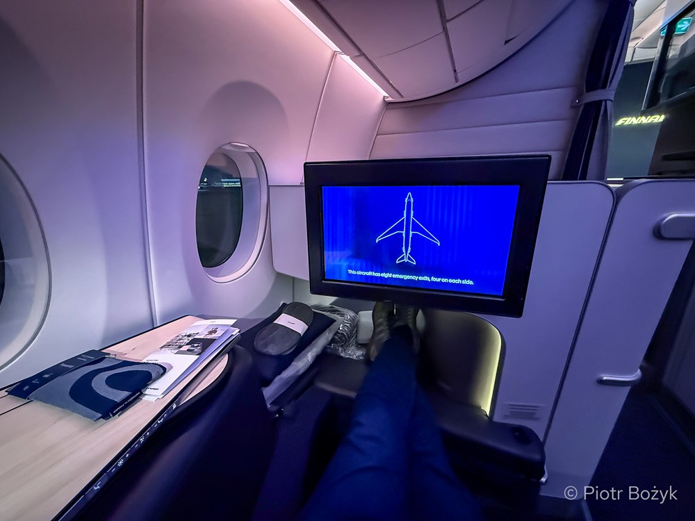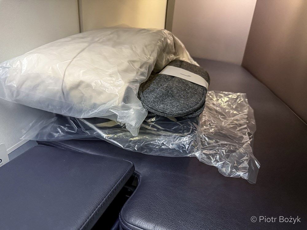 Każdy fotel biznesu posiada miękką poduszkę oraz lekka kołdrę w eleganckim wzorze, opatrzone logo Marimekko. Dodatkowo pasażerowie otrzymują mini materac, który jak jest złożony może pełnić funkcję kolejnej poduszki oraz miękkie, pluszowe kapcie. W schowku czekają także nauszne słuchawki z opcją wyciszenia (ANC).