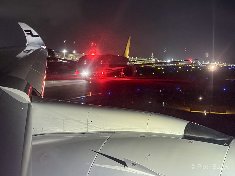 O godzinie 7:10 pojawia się informacja, że samolot jest gotowy do przyjęcia pasażerów na pokład, ale może wystąpić opóźnienie ze względu na sytuację w Warszawie, w której zamknięto jedną drogę startową i pojawiły się ograniczenia ruchowej, a co za tym idzie także opóźnienia. Po kilku minuta do maszyny wchodzimy rękawem. Tego dnia na rejsie do Warszawy operuje embraer E190 (OH-LKP). Na pokładzie oczekujemy kolejnych 50 minut przed otrzymaniem finalnej zgody na lot do stolicy Polski.