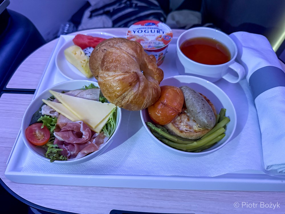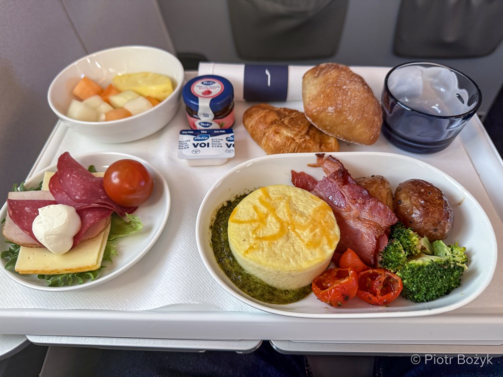 Podczas rejsu w klasie biznes serwowane jest na śniadanie na ciepło. Nasz zestaw to danie główne, owoce, pieczywo, dżemy, batonik oraz jogurt. Do tego wybór napoi ciepłych (herbata, kawa, czekolada) oraz zimnych (cola, soki, woda).