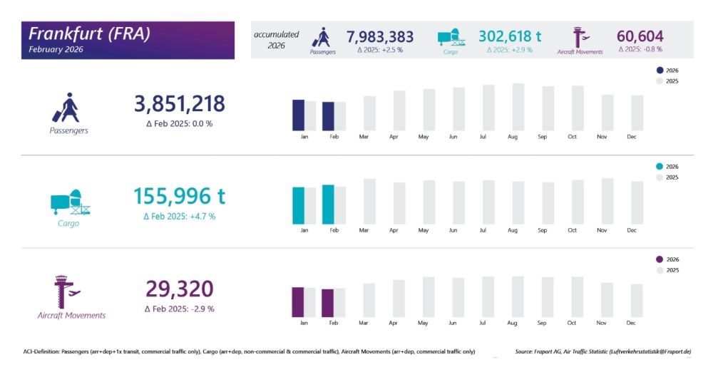 Port lotniczy we Frankfurcie nad Menem obsłużył w lutym dokładnie 3 851 218 pasażerów - poinformowało w oficjalnym komunikacie największe lotnisko Niemiec.
