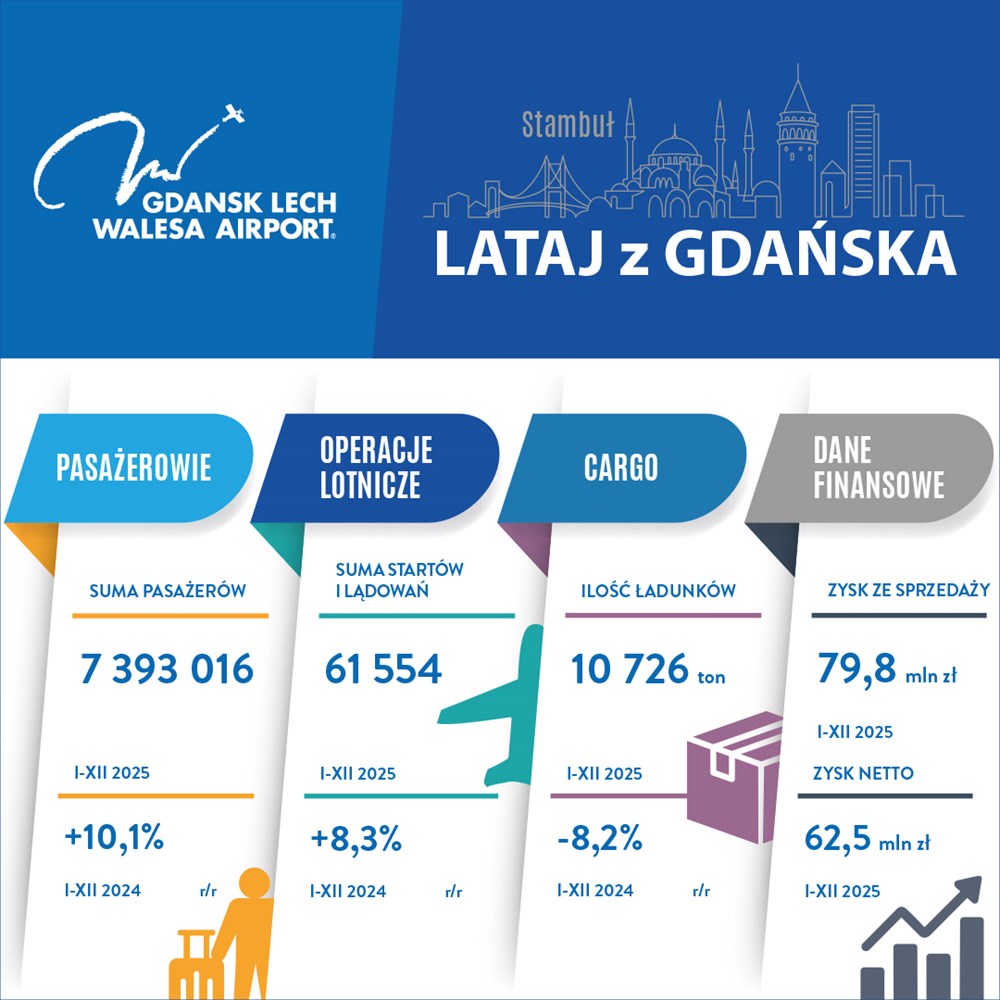 Port Lotniczy Gdańsk obsłużył w 2025 roku prawie 7,4 mln pasażerów - poinformowało trójmiejskie lotnisko w mediach społecznościowych