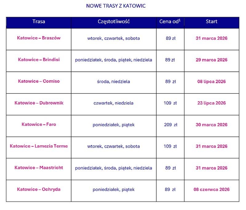 Rozszerzony letni rozkład został przygotowany z myślą o rosnącym i silnym popycie na przystępne cenowo podróże, oferując pasażerom ze Śląska jeszcze szerszy wybór wakacyjnych kierunków w regionie Morza Śródziemnego, Adriatyku oraz popularnych europejskich miast idealnych na city break. Wiele nowych tras to połączenia, odpowiadające utrzymującemu się zapotrzebowaniu klientów na wygodne i niskokosztowe podróże do najchętniej wybieranych miejsc turystycznych.