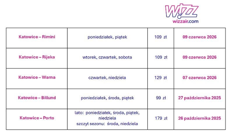 Wizz Air, które rozpoczęły operacje z Katowic w 2004 roku, będą obsługiwać najbardziej rozbudowany letni rozkład w swojej dotychczasowej historii, wprowadzając trzynaście nowych tras do ośmiu krajów. Rozszerzona siatka połączeń obejmuje Braszów, Brindisi, Comiso, Dubrownik, Faro, Lamezia Terme, Ochryda, Maastricht, Rimini, Rijekę, Warnę, Billund oraz Porto, wzmacniając łączność regionu i znacząco poszerzając możliwości podróży dla pasażerów z południowej Polski.