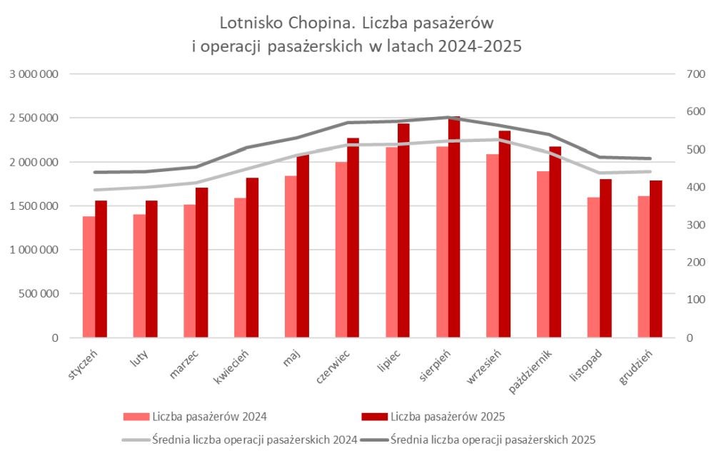 Dla porównania, w rekordowym dotychczas 2024 roku Lotnisko Chopina obsłużyło 21,28 mln pasażerów oraz ponad 117 tys. ton cargo. Wyniki 2025 roku oznaczają więc przyrost o ponad 2,8 mln pasażerów oraz historyczny wzrost w segmencie towarowym.