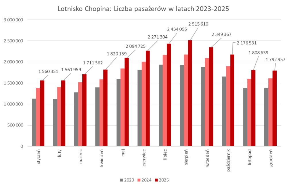 Rok 2025 zapisał się jako najlepszy w historii Lotniska Chopina. Z warszawskiego portu skorzystało 24 097 059 pasażerów, czyli o 13% więcej niż w rekordowym dotąd roku 2024. Dynamiczny wzrost dotyczył nie tylko ruchu pasażerskiego, ale również przewozów towarowych – w całym 2025 roku lotnisko obsłużyło ponad 137 tys. ton cargo, co oznacza wzrost o 17% r/r, ustanawiając nowy historyczny rekord.