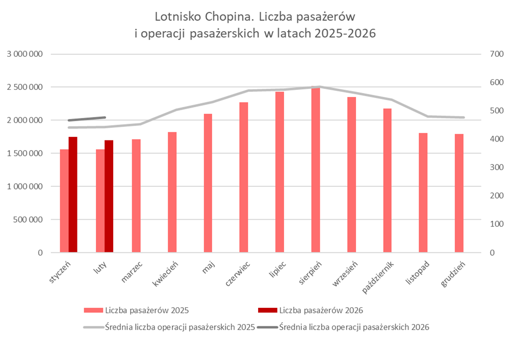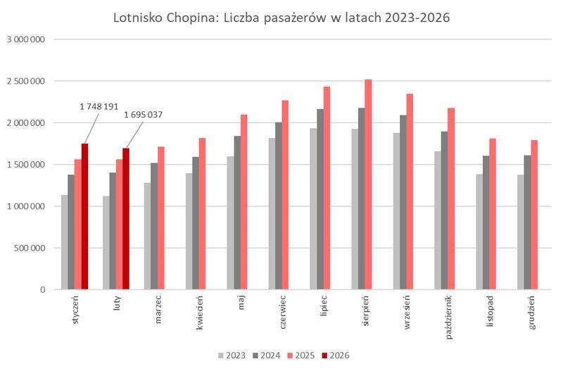 Drugi miesiąc 2026 roku przyniósł dalsze wzrosty w liczbie pasażerów odprawionych na Lotnisku Chopina. Stołeczny port obsłużył dokładnie 1 695 037 osób, co stanowi wzrost o 8,5 proc. w odniesieniu do lutego 2025. Rekordowym dniem w tym miesiącu i – jak dotąd roku – był piątek, 13 lutego. Odprawiono wtedy 69 331 osób. W lutym zrealizowano 13 350 operacji pasażerskich i 14 361 wszystkich operacji lotniczych.