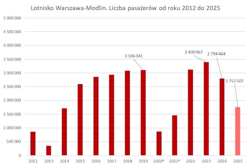 W całym 2025 roku podwarszawskie lotnisko obsłużyło dokładnie 1 752 485 pasażerów, zrealizowawszy 12 652 operacji lotniczych. Spadek wolumenu pasażerskiego wyniósł więc 1 041 979 – tj. 37,29 proc., podczas gdy w przypadku ruchu operacyjnego było 3 754 i 25,26 proc. Każdego dnia obsługiwano średnio 4 800 pasażerów i realizowano 34 operacje. Mniej od Modlina obsłużyły tylko najmniejsze lotniska regionalne.