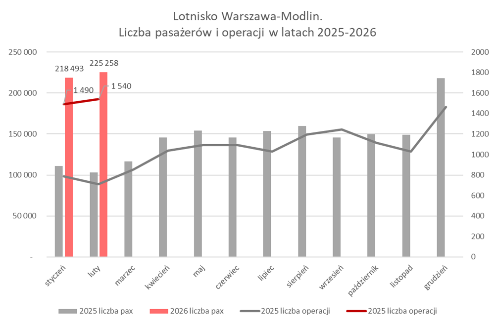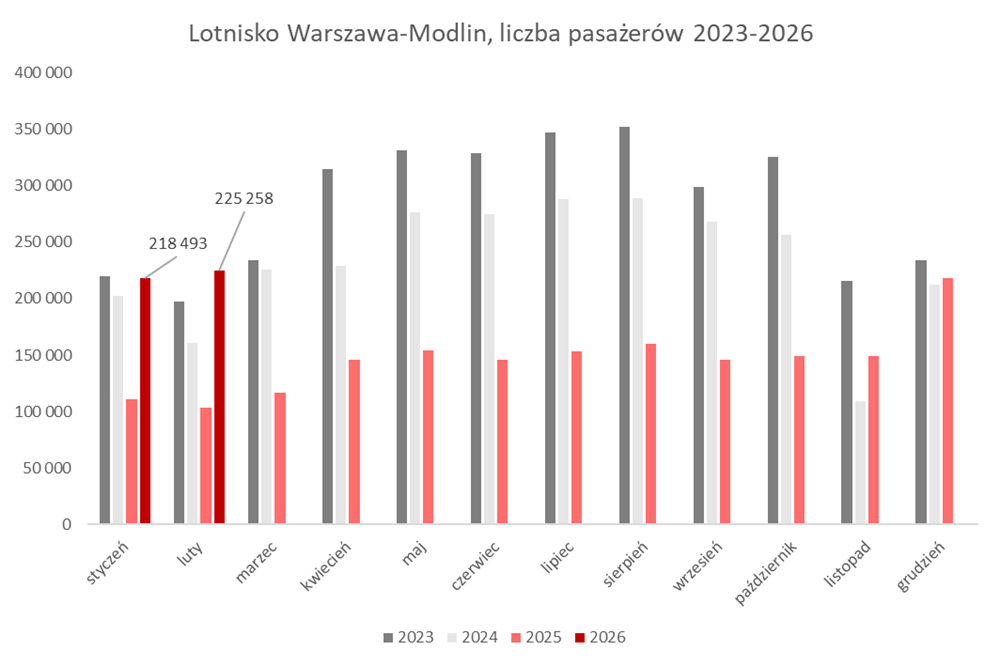 Luty okazał się więc czwartym miesiącem z rzędu ze wzrostem ruchu. Kolejne miesiące również przyniosą dużą poprawę rok do roku, dzięki czemu niskokosztowe lotnisko powinno obsłużyć w 2026 roku ponad 2,5 miliona pasażerów.