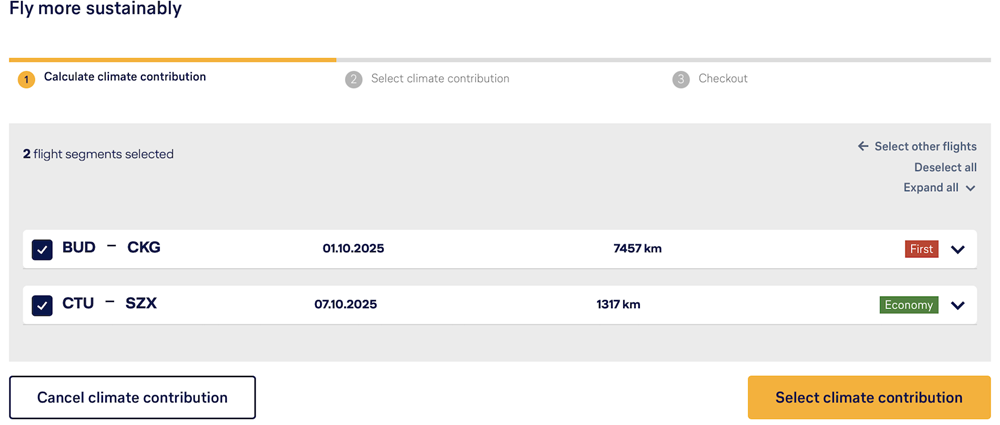 podróż Air China na trasie Budapeszt – Chongqing odbyta została w klasie ekonomicznej, to Miles & More uważa, że poróżowałem w klasie pierwszej (B787-9 Air China nie mają nawet klasy pierwszej!). System nie proponuje offsetu lotu powrotnego (Shenzhen – Pekin – Budapeszt), za to sugeruje kompensację rejsu wewnętrznego Chengdu – Shenzhen. Propozycja jest tylko propozycją, ale sam fakt jest już dość zaskakujący, jeśli pod uwagę weźmie się „oferty” cenowe offsetu.