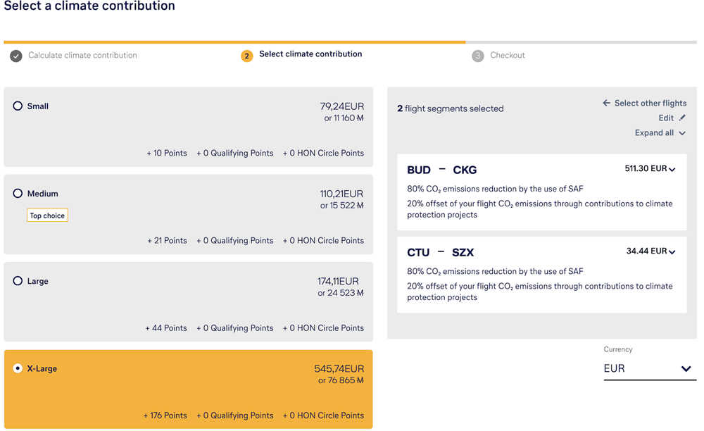 Pakiet „Small” kosztuje 79 euro. Średniej wielkości kompensacja to już wydatek rzędu 110 euro, podczas gdy pakiet „large” wyceniony jest na 174 euro. Na aż 545 euro (511 euro za lot Budapeszt – Chongqing) wyceniono offset „X-Large”, choć bilet tam i powrotem kosztował… niecałe 1 650 złotych. Decydując się na kompensację i płacenia powyższych kwot spowodowałoby, że na pokrycie emisji dwutlenku węgla (po odbytym locie?) przez użycie SAF miałoby być przeznaczone 80 proc. kwoty, a 20 proc. na projekty klimatyczne.