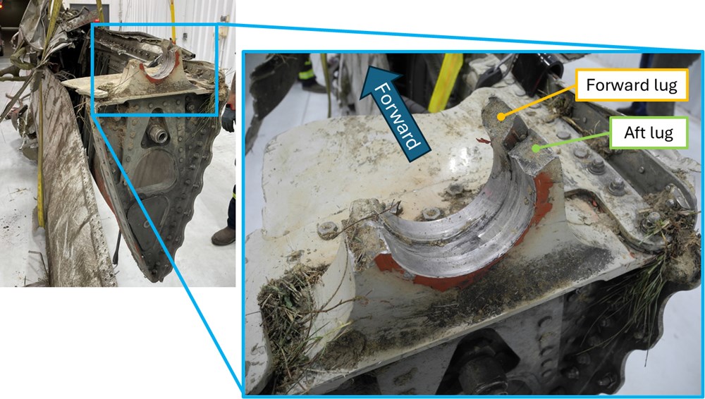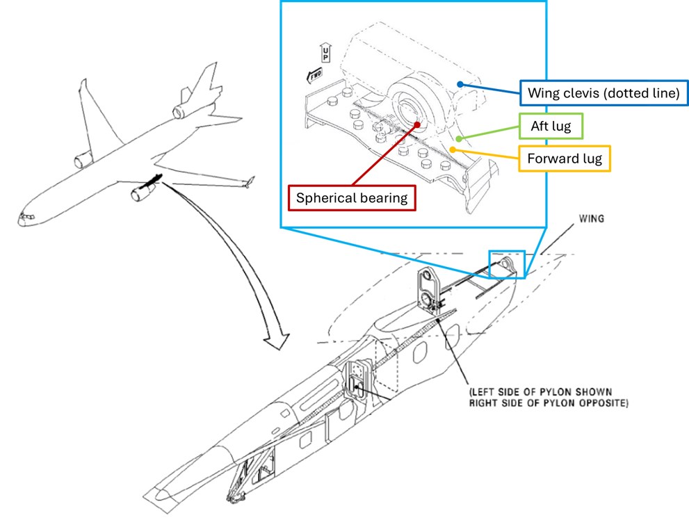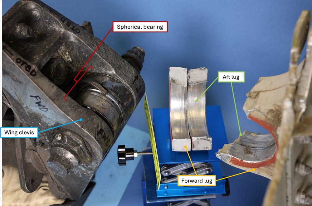 Wstępna inspekcja ujawniła pęknięcia zmęczeniowe w tylnym mocowaniu pylonu, co może wskazywać na długotrwałą degradację strukturalną. Pęknięcia tego typu prowadzą do utraty nośności i są szczególnie niebezpieczne w strukturach przenoszących siły w fazie startu.