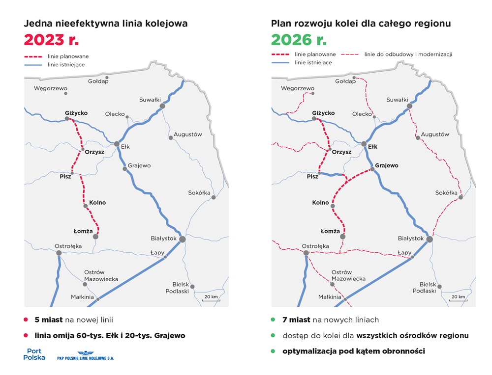 Port Polska przypomina, że w północno-wschodniej Polsce od 2024 roku trwa modernizacja linii kolejowych na odcinkach: między Łapami i Ostrołęką, ze Śniadowa do Łomży czy między Ełkiem i Białymstokiem w ramach międzynarodowej trasy do krajów bałtyckich Rail Baltica. Podkreśla przy tym, że nie zostały wstrzymane prace nad nowymi liniami kolejowymi w Polsce północno-wschodniej.