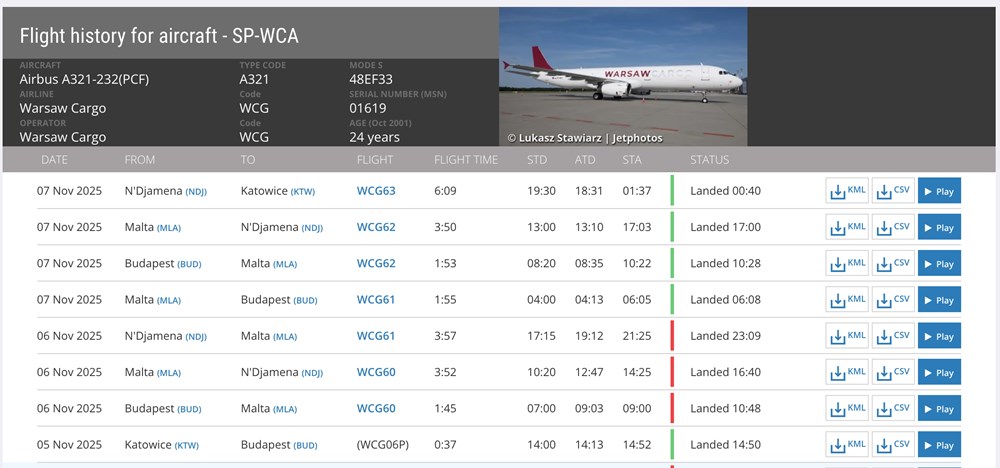 Jak wynika z danych FR24, w swój pierwszy rejs polski frachtowiec wyruszył 6 listopada z Katowic do Budapesztu (rejs WCG 60) z którego wykonał rejs na Maltę, a następnie do Ndżameny. Ze stolicy Czadu (rejs WCG 61), powrócił przez Maltę do Budapesztu. Kolejnego dnia, 7 listopada, maszyna wykonała podobne rejsy z Budapesztu (rejs WCG 62), a następnie ze stolicy Czadu powróciła do swojej macierzystej bazy w Katowice Airport (rejs WCG 63).